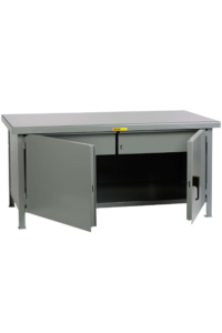 Cabinet enclosure with 2 locking doors provides ample secure storage space. Heavy-duty 7 gauge top is formed on all four sides with a “comfort edge” radius. Rugged, all-welded unit has a fixed height of 34″