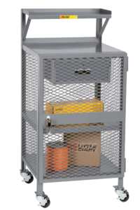 - Enclosed shelves are 13 gauge expanded metal with keyed locking door